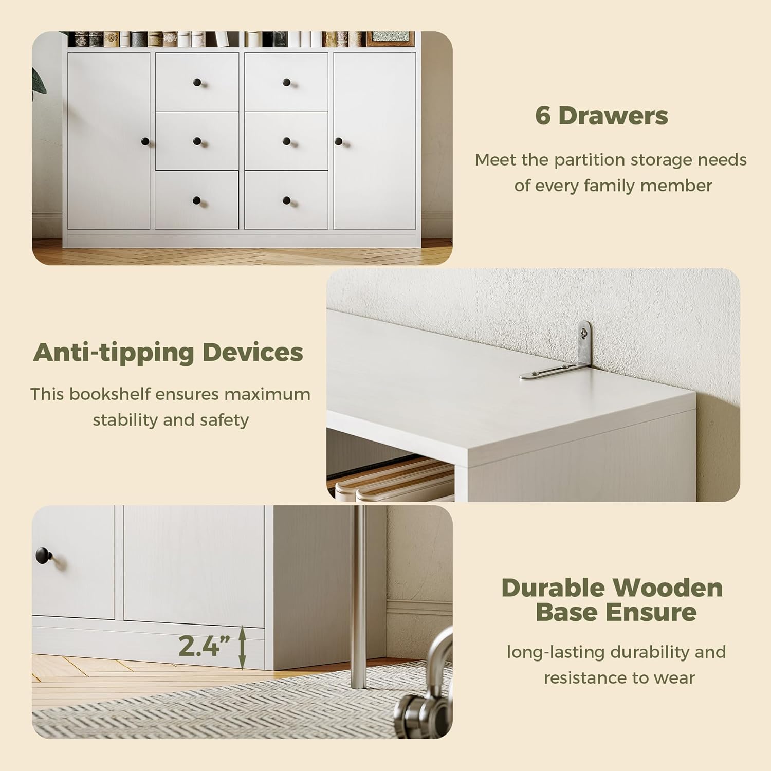 IRONCK 78.7" Bookcase with 6 Drawers, 6 Tier Large Bookshelf with 2 Doors, Large Bookcase with Adjustable Shelves, Tall Storage Cabinet for Home Office, Living Room, White