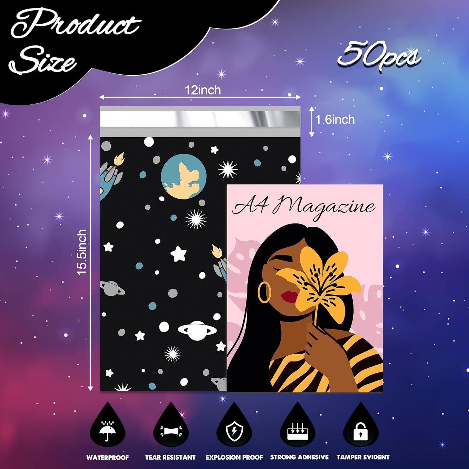 Planets Poly Mailer 12x15.5 Inch 50 Pcs, Waterproof Shipping Bags for Clothing, Tear-Resistant Mailier Bags, Strong Mailing Bags with Self-Seal
