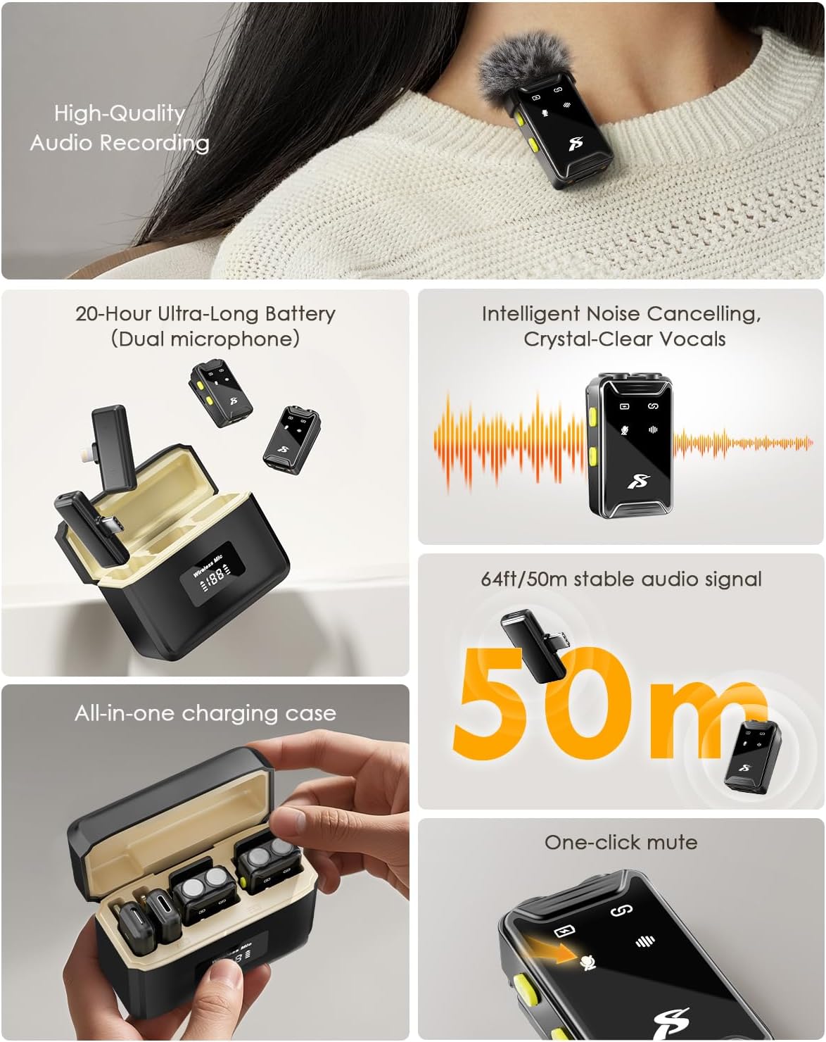 - Studio-Quality Sound: This wireless lavalier microphone features a high-sensitivity condenser mic and advanced noise reduction technology, ensuring your voice is captured clearly even in noisy environments. With built-in reverb effects, your voice sounds richer and more professional—perfect for achieving studio-quality audio. It’s an ideal wireless microphone for iPhone and Android.