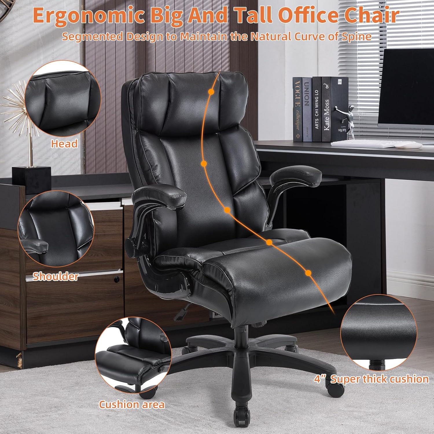 Big and Tall Office Chair 500lbs Wide Seat Executive Office Desk Chair High-Back Office Task Chair with Flip-Up Armrest, Ergonomic Lumbar Support Computer Office Chairs for Heavy People(Black)