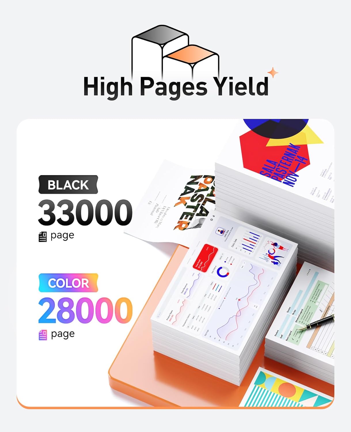 - Yield & Version: 33,000 pages for Black and 28,000 pages Color toner cartridge (A4, 5% Coverage), High Yield Version 658X toner cartridges.