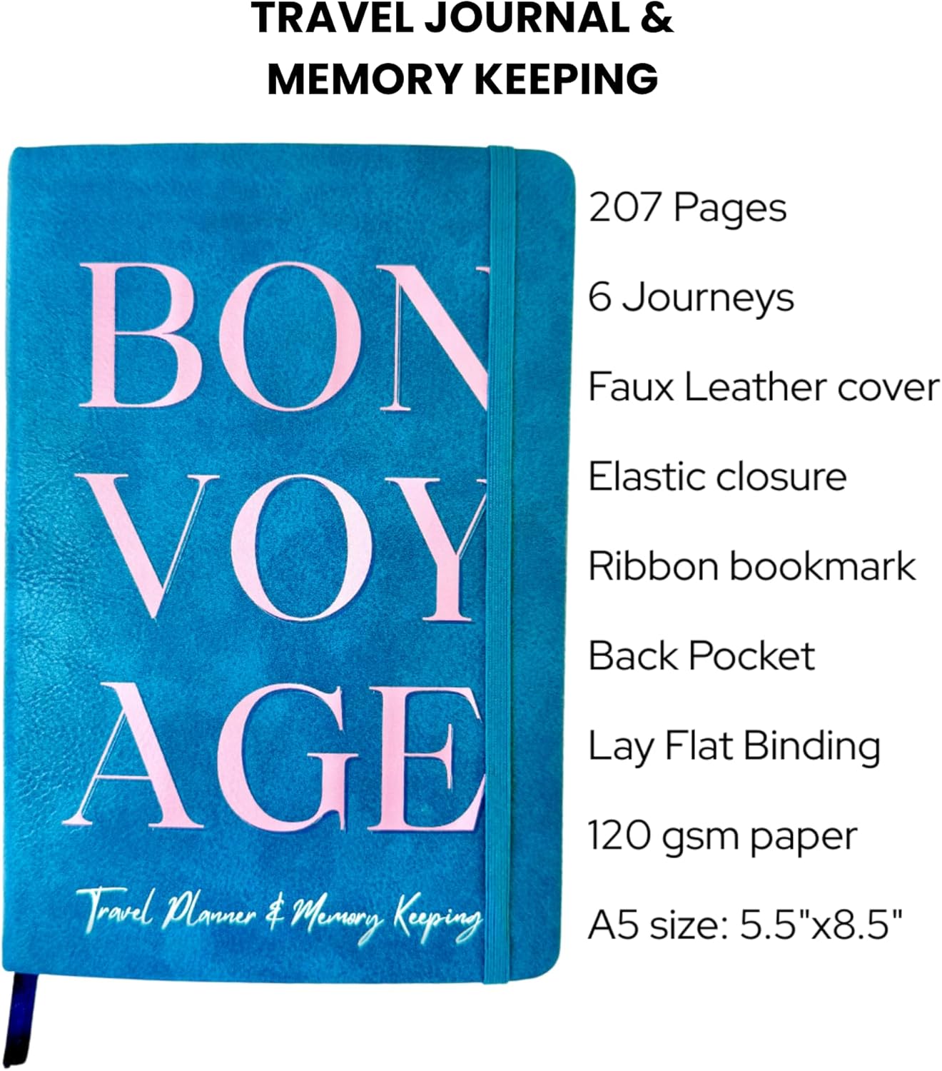 - A5 SIZE & PREMIUM QUALITY DESIGN – This travel planner features a stylish eco-leather hardcover, thick 120gsm paper to prevent ink bleed, elastic band closure, ribbon bookmark, inner pocket for keepsakes and stickers. Sized at 5.8" x 8.3", it's perfect for travel.