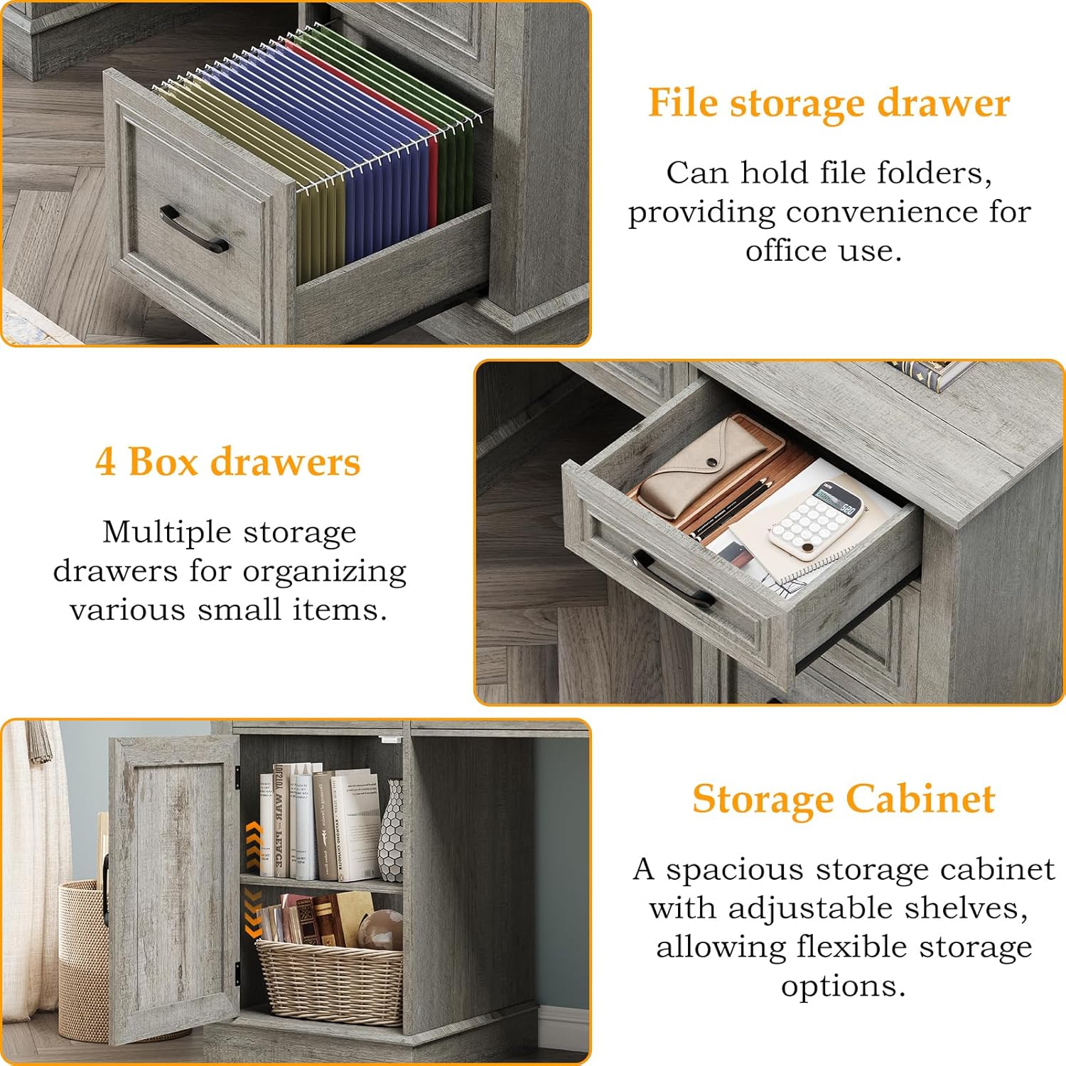 67" H Farmhouse Executive Desk with Hutch. Wood Workstation with 5 Drawers, Storage Cabinet, File Drawers and Charging Station, Ideal as Office Desk, Computer Desk for Home Office and Study.Gray