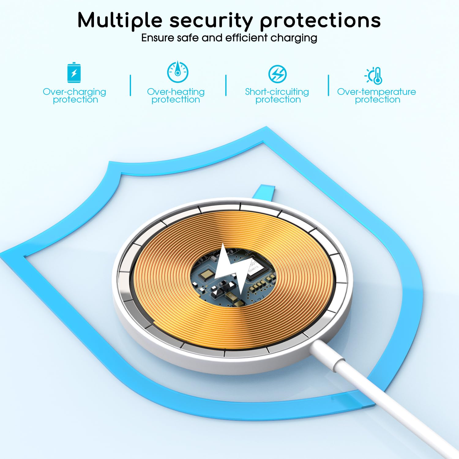 - [ Intelligent Safety Protection ] The apple magsafe charger adopts intelligent chipset, high-quality materials and advanced Mag Safe magnetic coil to ensure safe and efficient charging. The built-in intelligent chip provides multiple protections to protect your iPhone from over-heating, over-voltage, over-charging and short circuits.