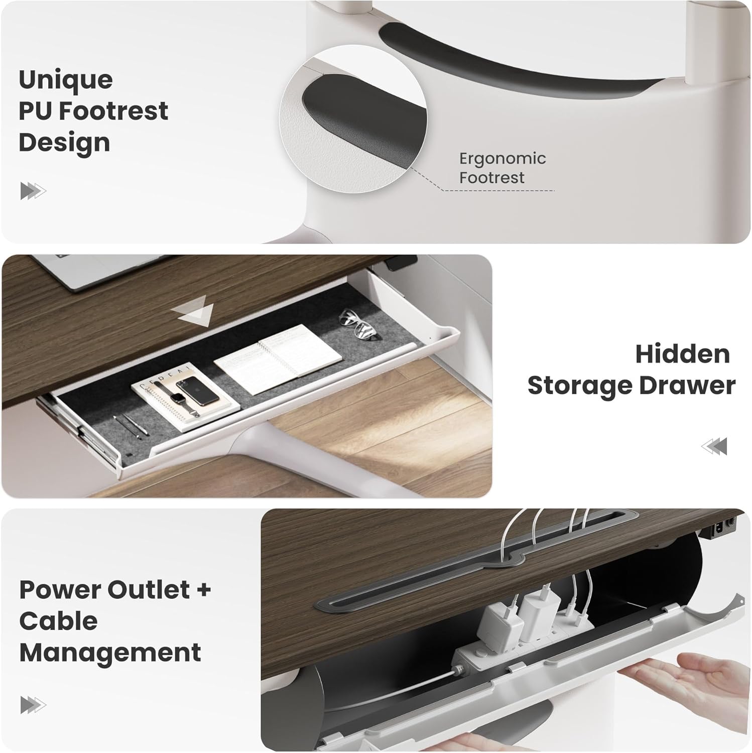 COLAMY Electric Standing Desk, Whole-Piece Gaming Desk with Dual Motors, Ergonomic Footrest, Drawers for Storage, Adjustable Height Sit-Stand Desk for Home Office (MFC Desktop, Walnut + White)