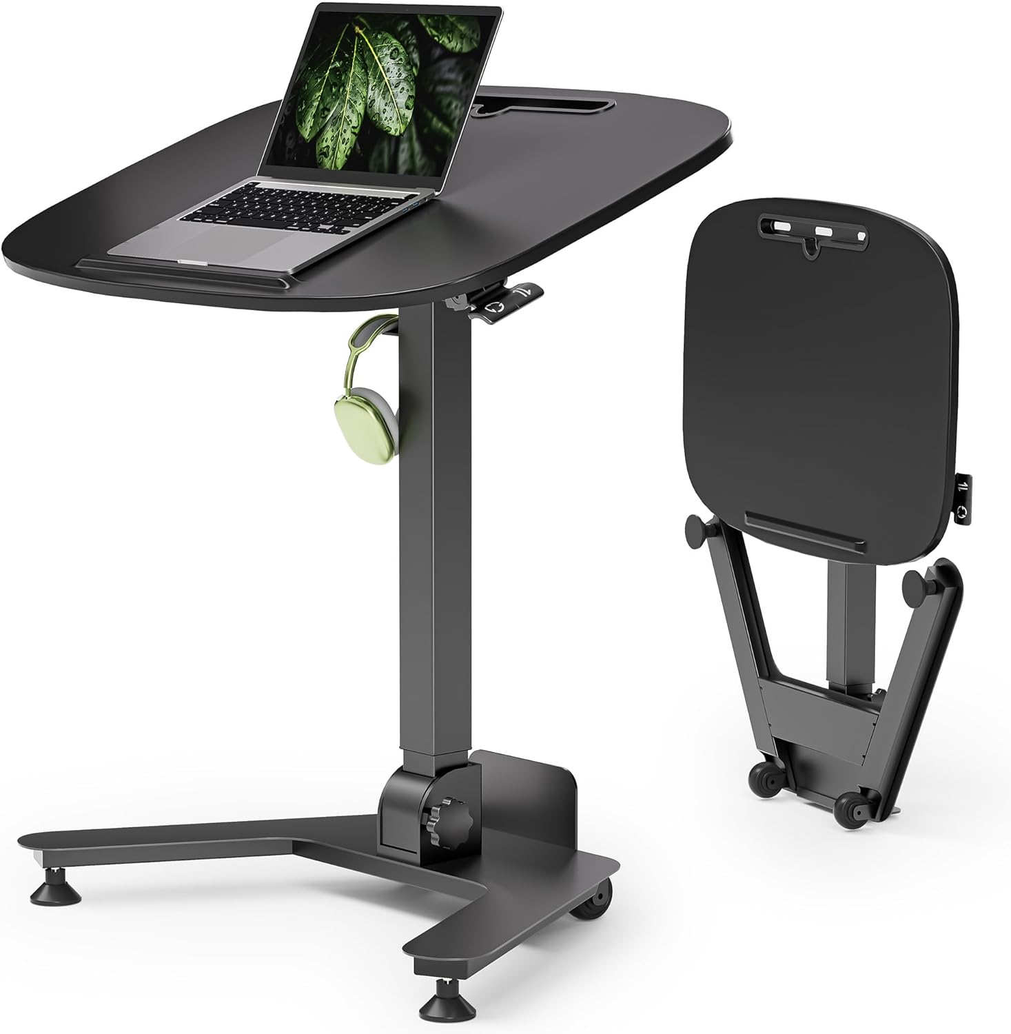 Foldable Pneumatic Height Adjustable Mobile Standing Desk with 90° Tiltable Tabletop, 27.2x18.9 Inch Portable Laptop Desk with Wheels, Holds Up to 66.1lbs for Home Office, Study, Black