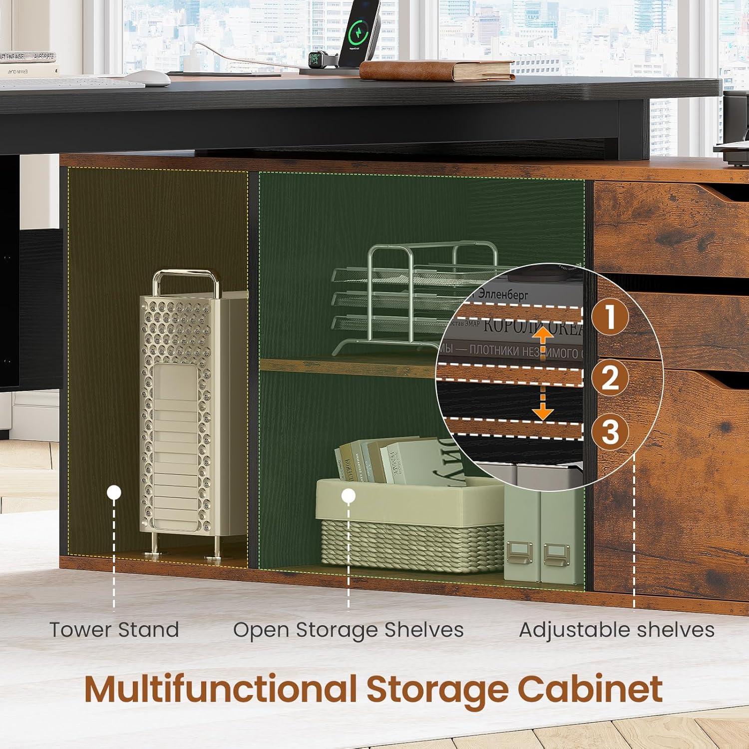 - 【Modern Executive Desk】This L-shaped executive desk is both functional and uniquely pieced together to provide not only the practical performance of modern furniture, but also to add beauty to your room. The elegant and generous appearance makes this desk with filing cabinet extra beautiful in your space.