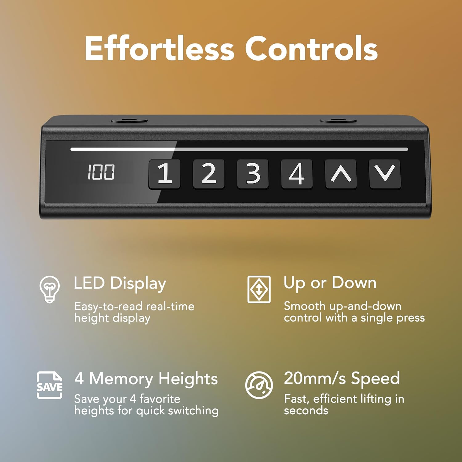 - Convenient Memory Presets: Featuring four programmable height settings, the smart control panel lets you switch to your preferred height with a single touchβno more tedious manual adjustments.