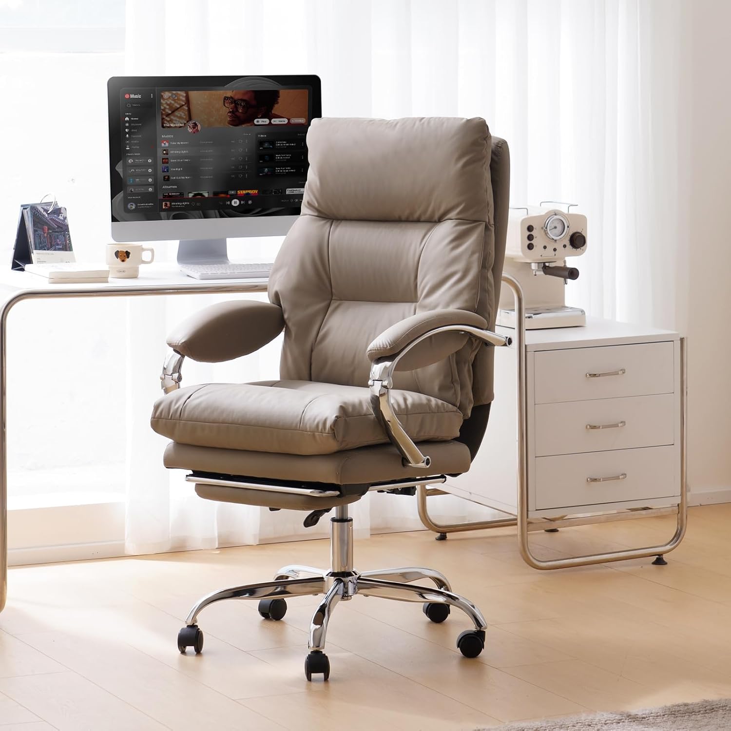 LEAGOO Reclining Office Chair with Foot Rest, Executive Office Chairs with Arms, Ergonomic High Back PU Leather Comfy Swivel Computer Desk Chairs with Wheels and Lumbar Support for Home Office, Khaki