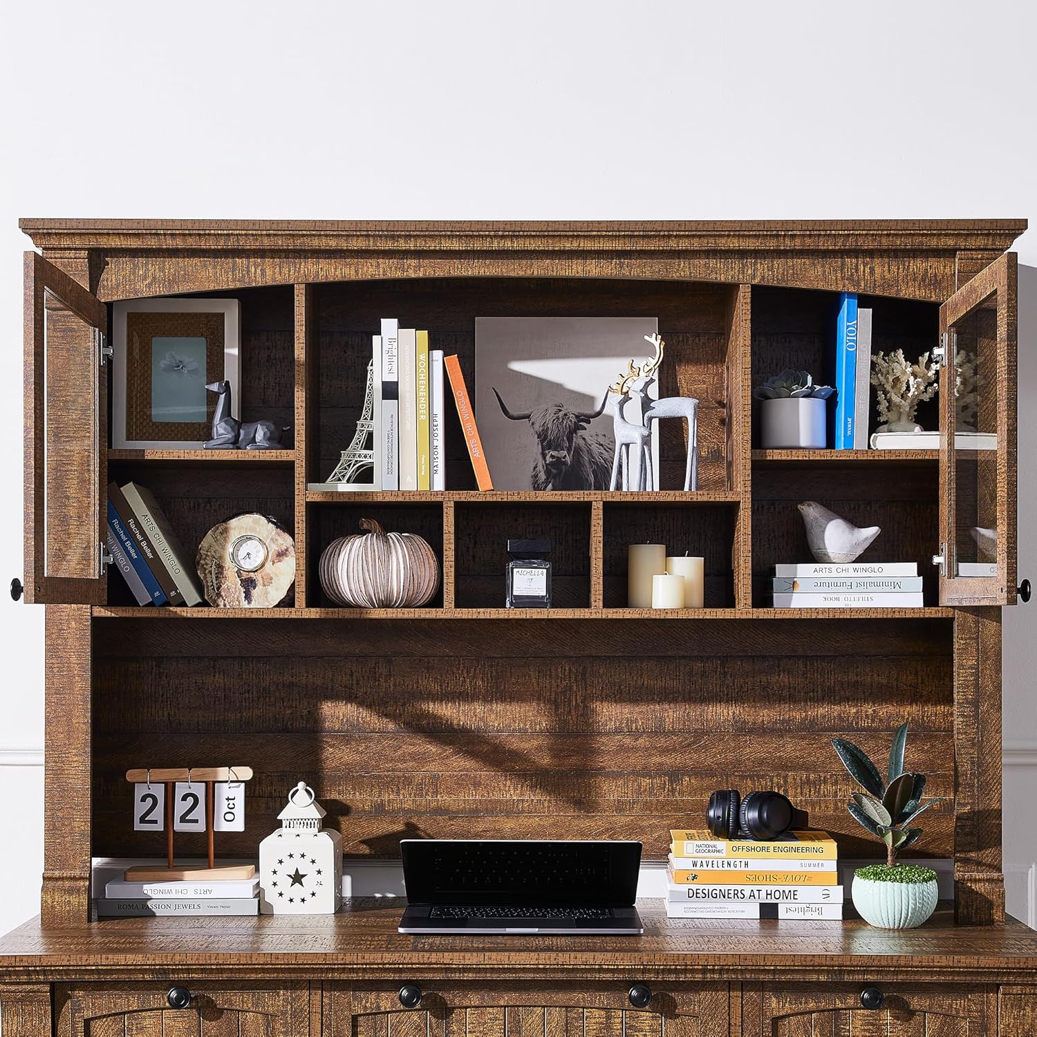 OKD Farmhouse Hutch for 60" Executive Desk, Office Desk Storage Cabinet with Glass Doors and Shelves, Top Hutch Organizer for Home Office - Reclaimed Barnwood