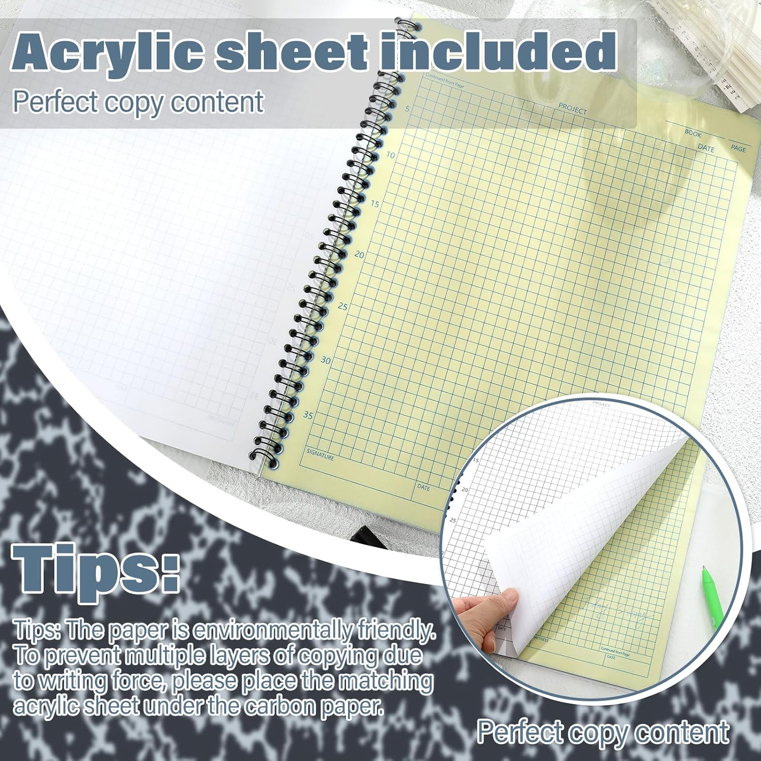 - Carbonless Lab Notebook: the set includes 2 carbonless copy notebook, measuring 8.5 x 11 inches/ 22 x 28 cm, each containing 50 writing pages and 50 sheets of carbon paper, a total of 100 pages, adequate quantity to meet your needs; Also included is a clear acrylic sheet measuring 8.5 x 11 inches / 22 x 28 cm; Lab notebook help to quickly generate copies of notes, thus simplifying the sharing or saving backups of important lab data