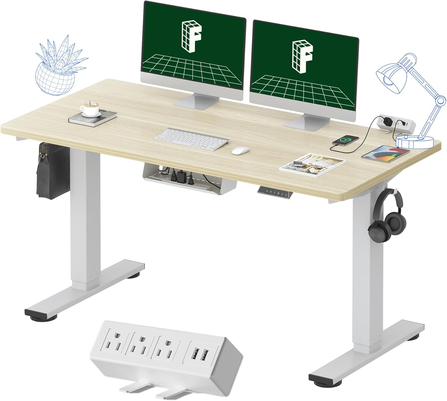 FLEXISPOT EN2 Whole-Piece Standing Desk with Clamp Power Strip, 55 x 28 Electric Stand Up Height Adjustable Desk with Cable Management (White Frame + 55" White Wood Grain Desktop, 2 Packages)