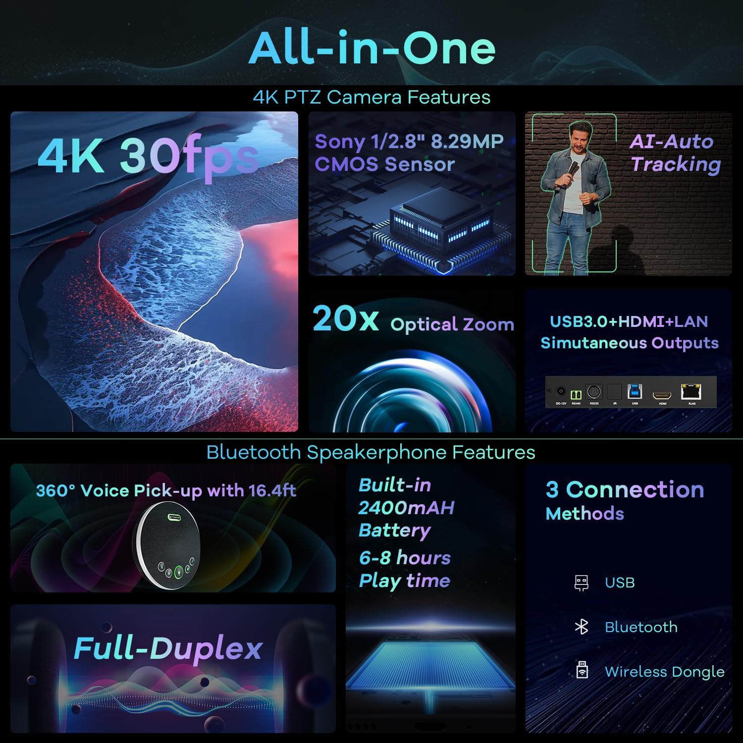 - ✈【4K PTZ Conference room camera system】TONGVEO 4K PTZ Conference room camera system combines an upgraded 20x Zoom AI-auto Tracking Ultra HD 4K PTZ Camera and and conference Bluetooth speakerphone, the 4K PTZ Camera outputs 4K/30fps video streams to meet diverse image quality and smoothness,and the conference Speaker adopts Full duplex audio design, to speak and be heard simultaneously, This all-in-one design offers a cost-effective yet professional video and audio conferencing solution