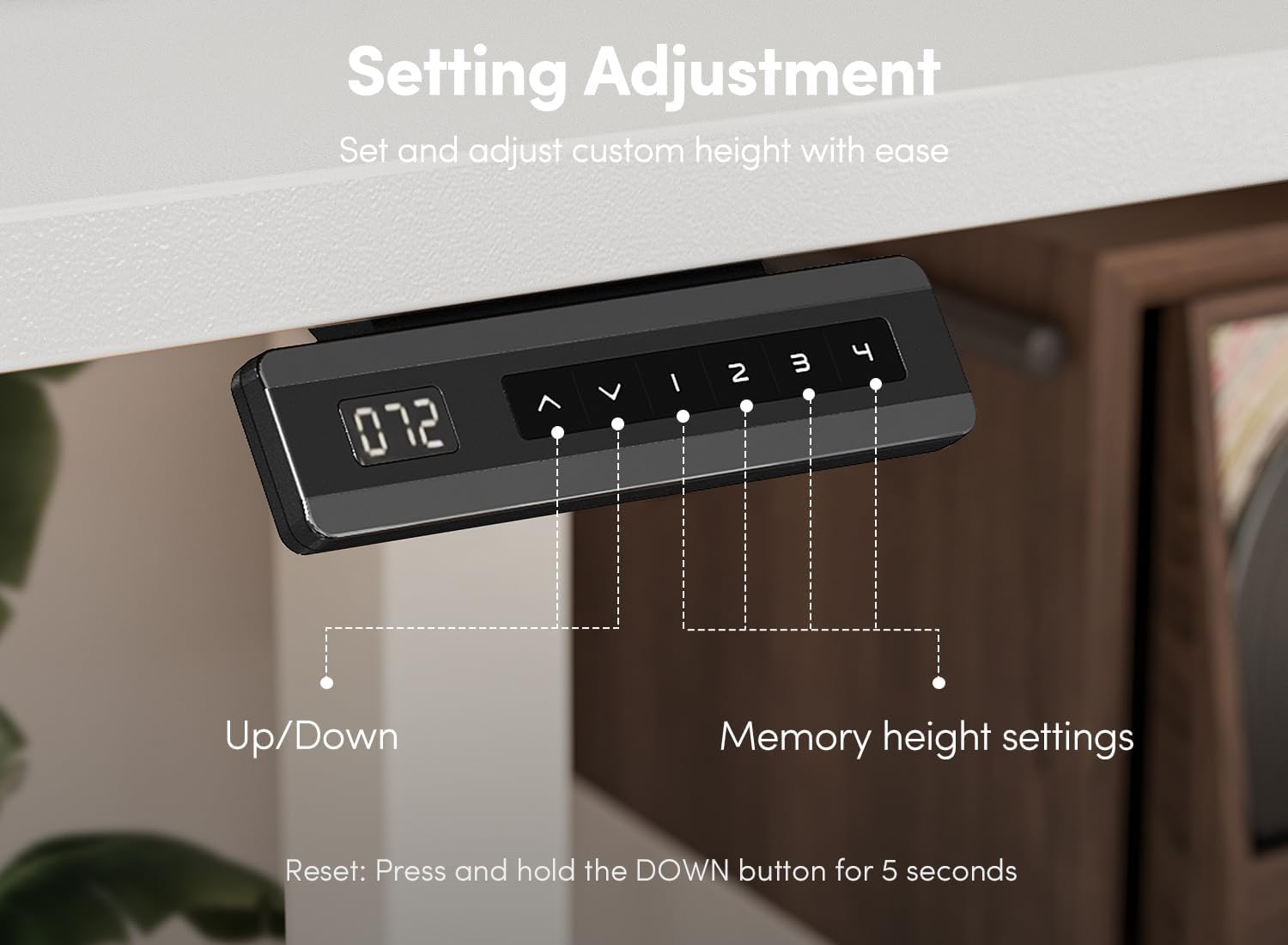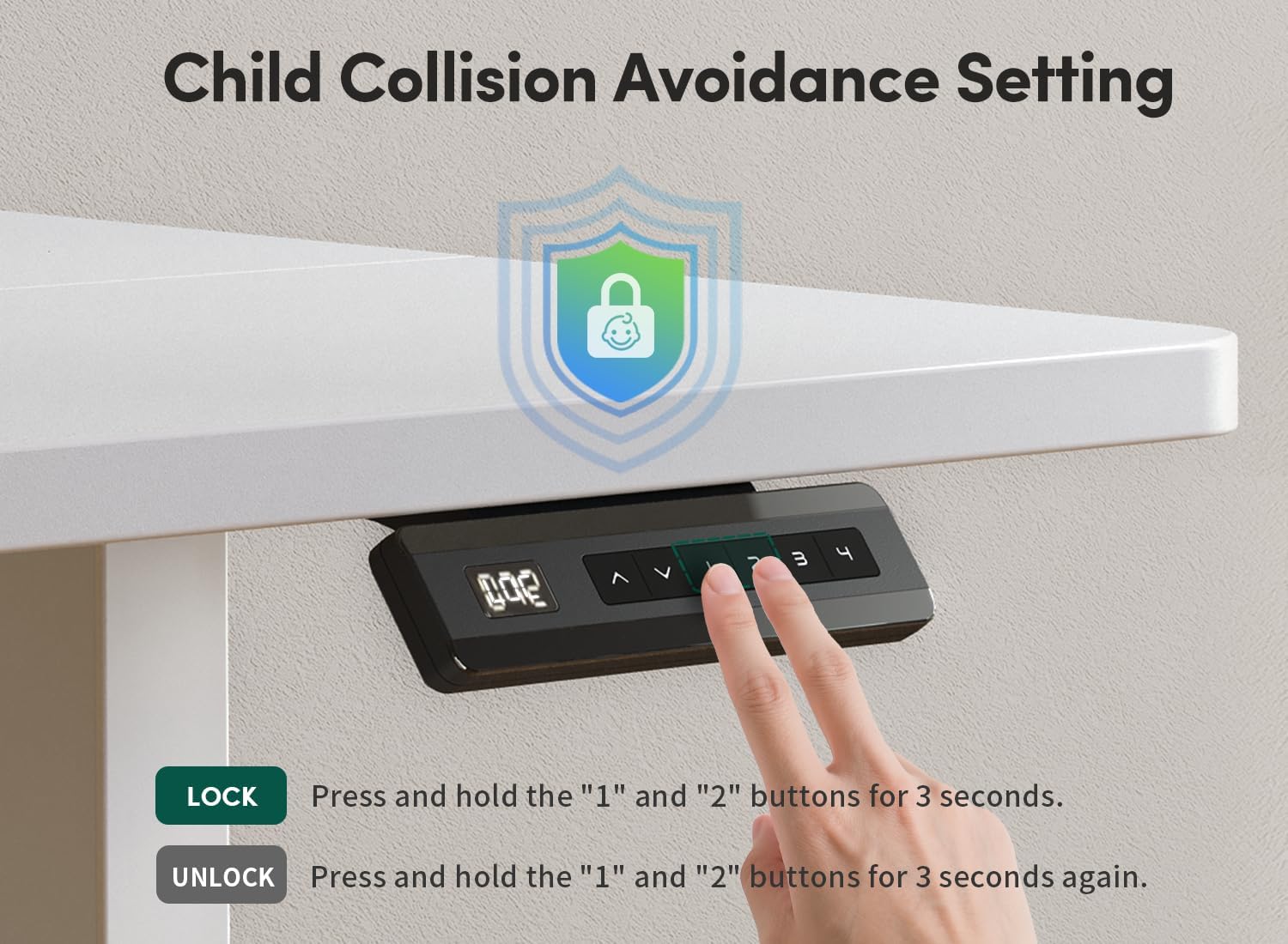 - Memory Height and Anti-Collision Technology: The standing desk is equipped with 4 programmable memory height buttons. If an obstacle is encountered during the lifting process, it will move 2 cm in the opposite direction to protect the motor and tabletop from damage.