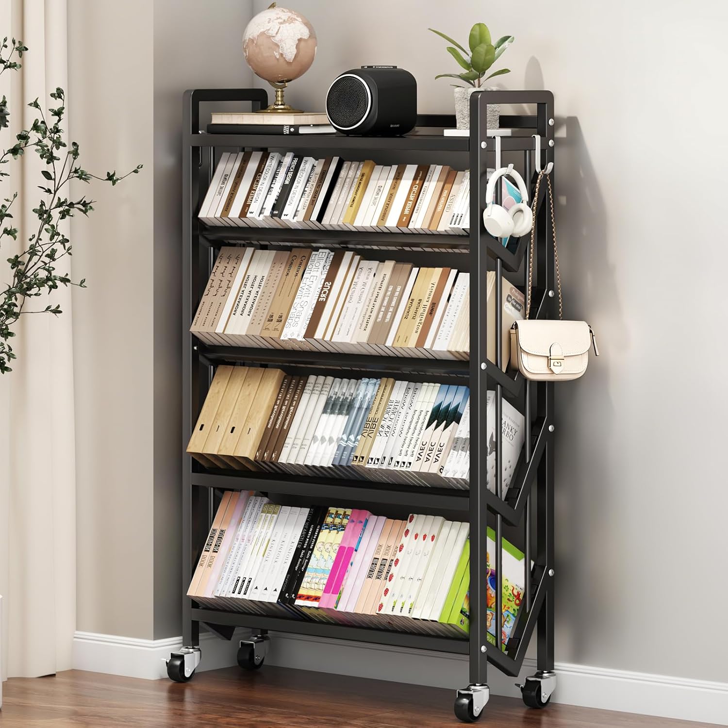 Bookshelf Movable Book Cart Multi-Layer Storage Rack Large-Capacity Rolling Cart L-Shaped Carbon Steel Shelf Suitable for Storing Books, Magazines, Newspapers, Shoes