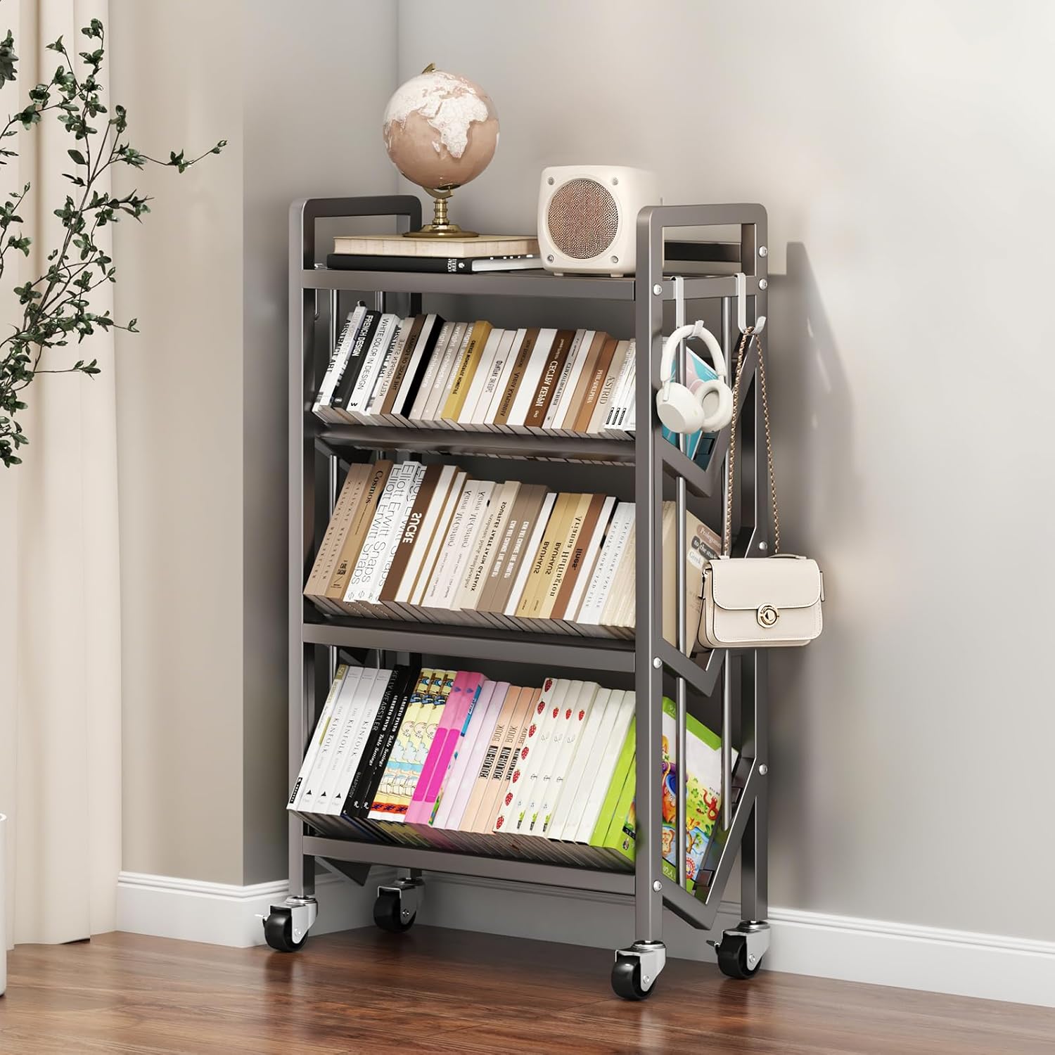 Bookshelf Movable Book Cart Multi-Layer Storage Rack Large-Capacity Rolling Cart L-Shaped Carbon Steel Shelf Suitable for Storing Books, Magazines, Newspapers, Shoes