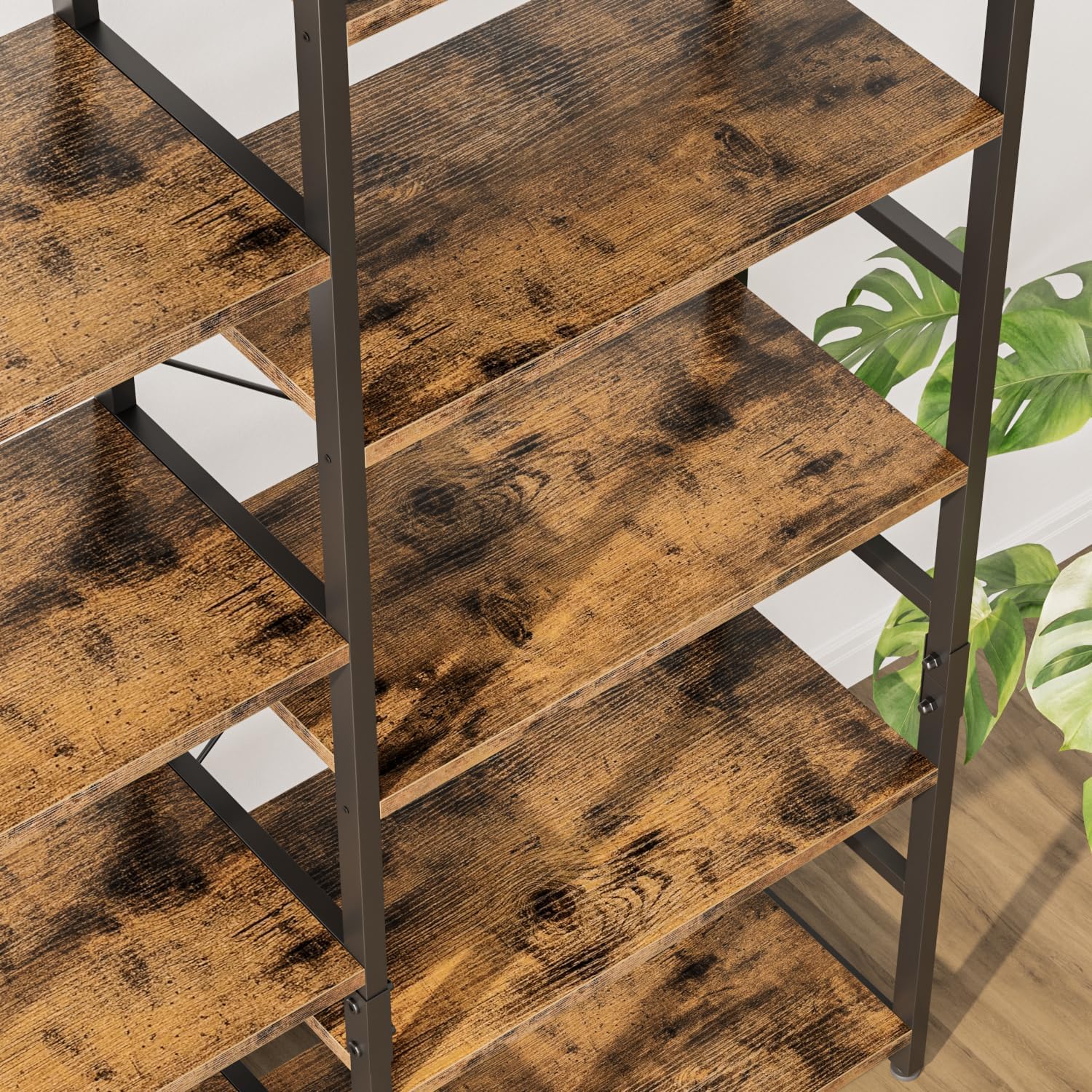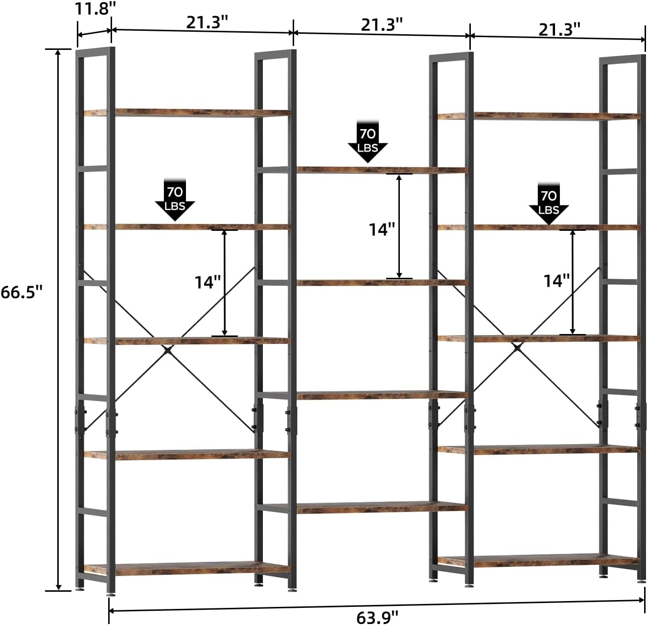 OTK Triple Wide 5 Tier Bookshelf, Rustic Industrial Style Bookcases with 14 Open Display Shelves, Wide Bookshelves for Bedroom, Living Room and Home Office, Rustic Brown