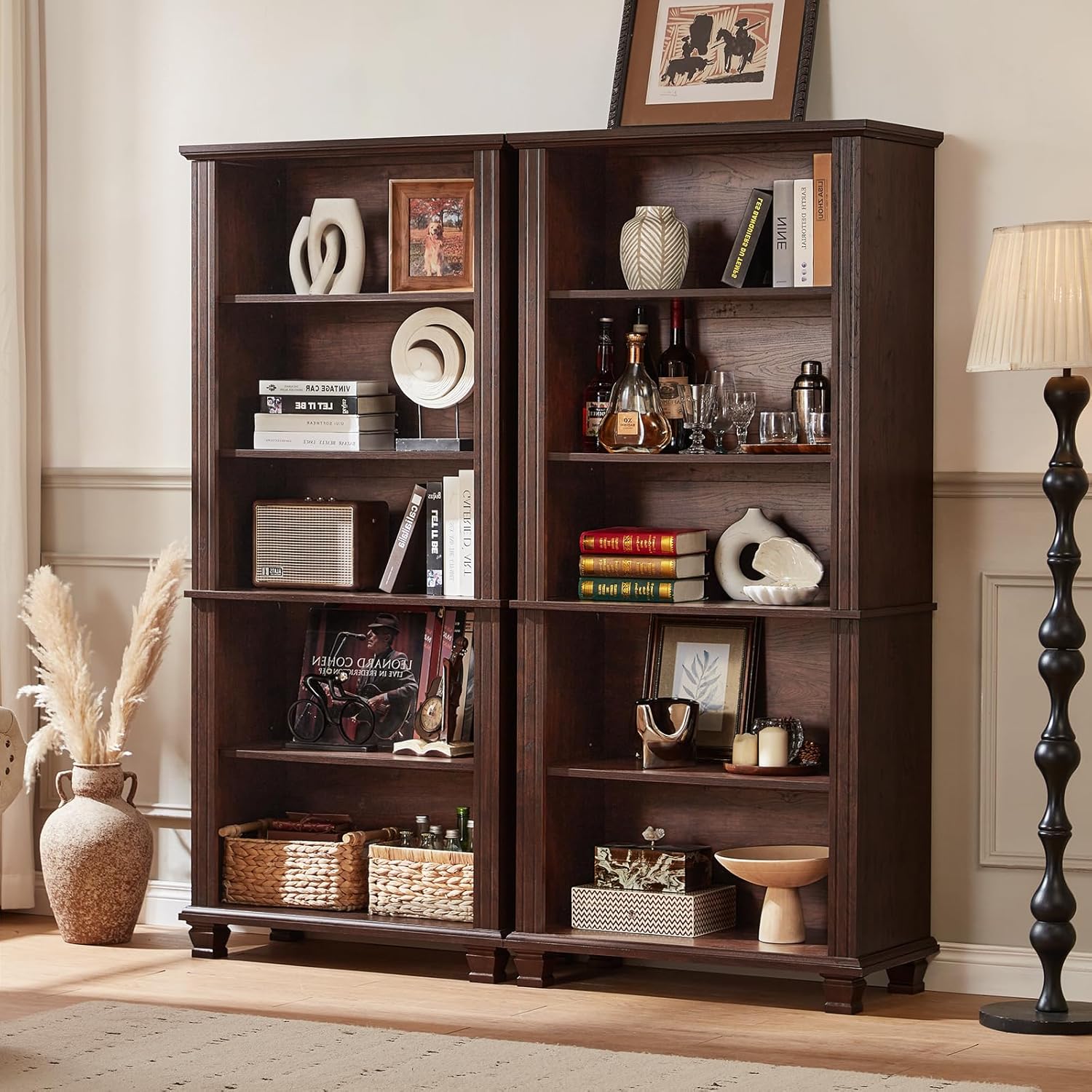 - [Rustic Style] This rustic bookshelf combines classic colors with modern linear design, which can be well integrated into rooms with different decorative styles, adding a touch of warmth to your space. You can also place this 5 - tier bookshelf in different locations as needed, such as the living room, office, study or library. This wooden bookshelf is available in four colors: walnut, black, white and green, providing you with a wide range of choices.