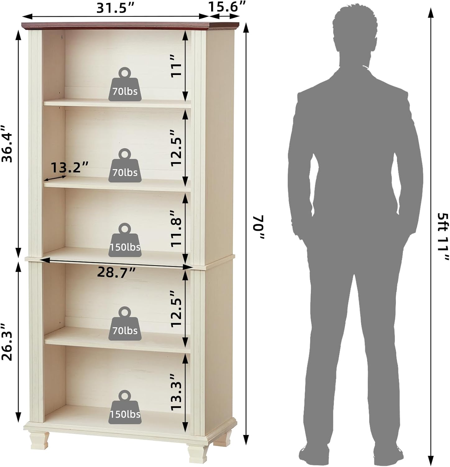 70" Tall White Bookshelf,5 Tier Wood Book Shelf with Adjustable Shelves & Wood Legs,Free Standing Farmhouse Bookcase with Open Display Storage,Vintage Kids Bookshelves for Nursery,Bedroom