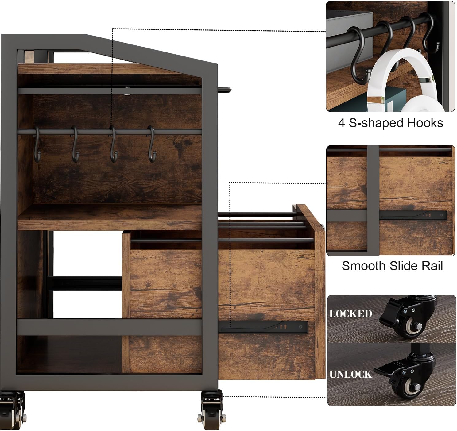 - Special Feature : 4 S Hooks, Lockable, Pull Out Hanging File Rack, Wheeled