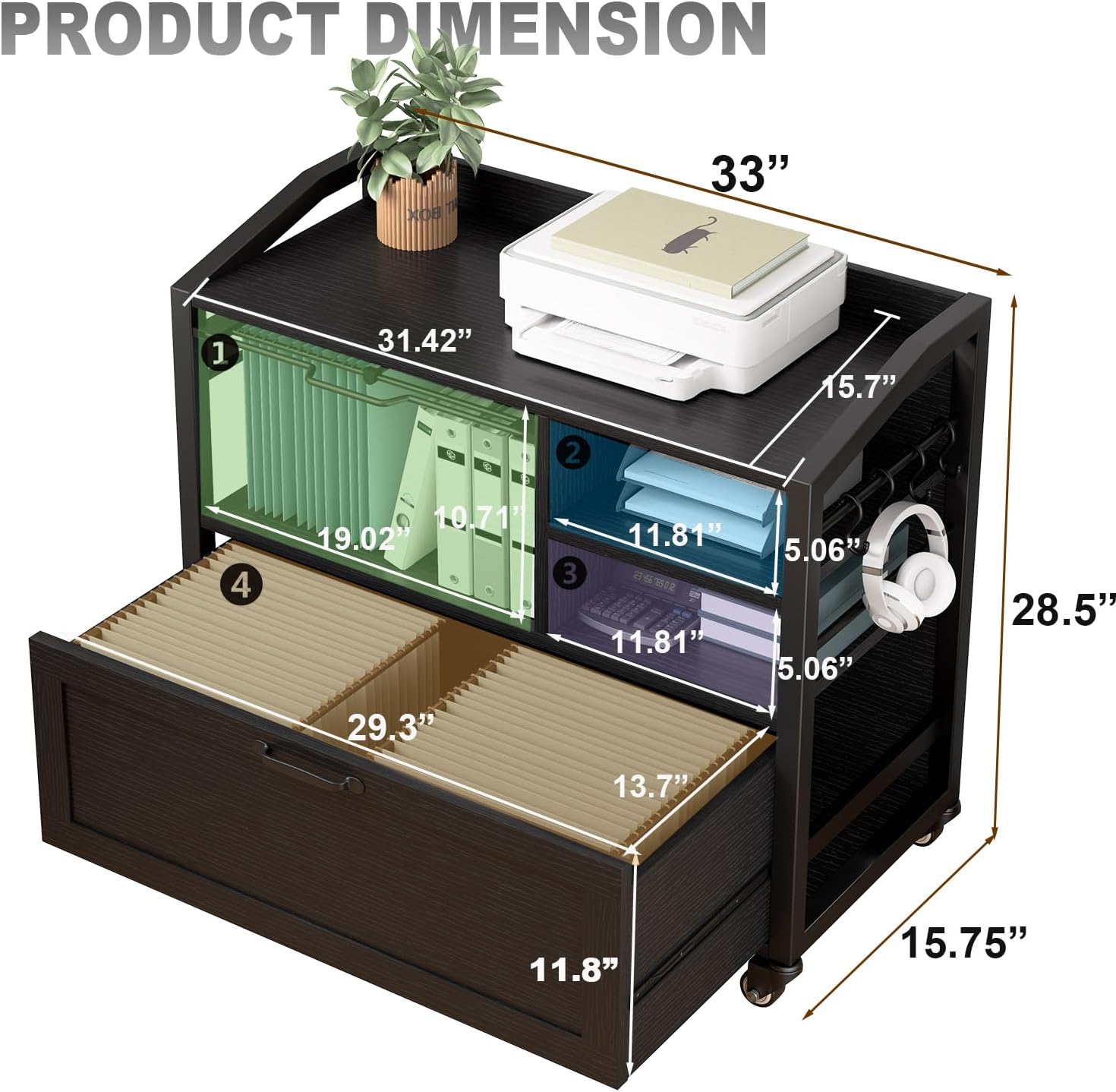 - All-in-One Storage Solution:Stay organized with 4 removable S-hooks for headphones, bags, or accessories. This filing cabinet organizer also features 2 open storage shelves for books, binders, or office essentials. The spacious 31.42”L × 15.7”W top surface holds printers, scanners, or décor, doubling as a printer stand with storage. With multiple compartments, it keeps documents and supplies neatly arranged for any home office filing cabinet setup.