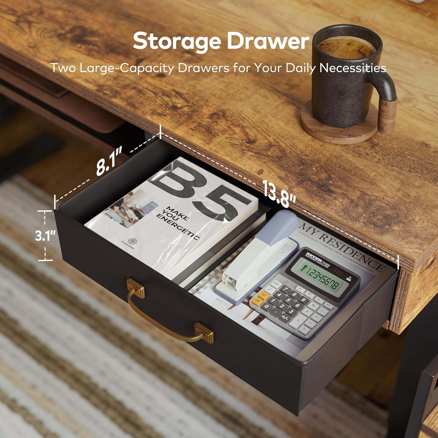 FEZIBO 55 x 24 Inch Height Adjustable Electric Standing Desk with Double Drawer, Stand Up Desk with Storage Shelf, Rustic Brown